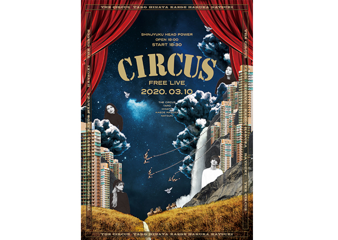 インディーズ音楽集団「CIRCUS」のライブのビジュアルデザイン。まさにサーカスをテーマに制作。Taro、楓&遥、HINATA、NATSUKI という4つの個性がユニークにシンクロし広がっていくエネルギーや音楽感をコラージュで表現した。モンゴルの草原やアジアのビル群を用いて異国へトリップするようなイメージを構成。トーンは重めにして深い眠りの夢の世界を表現した。